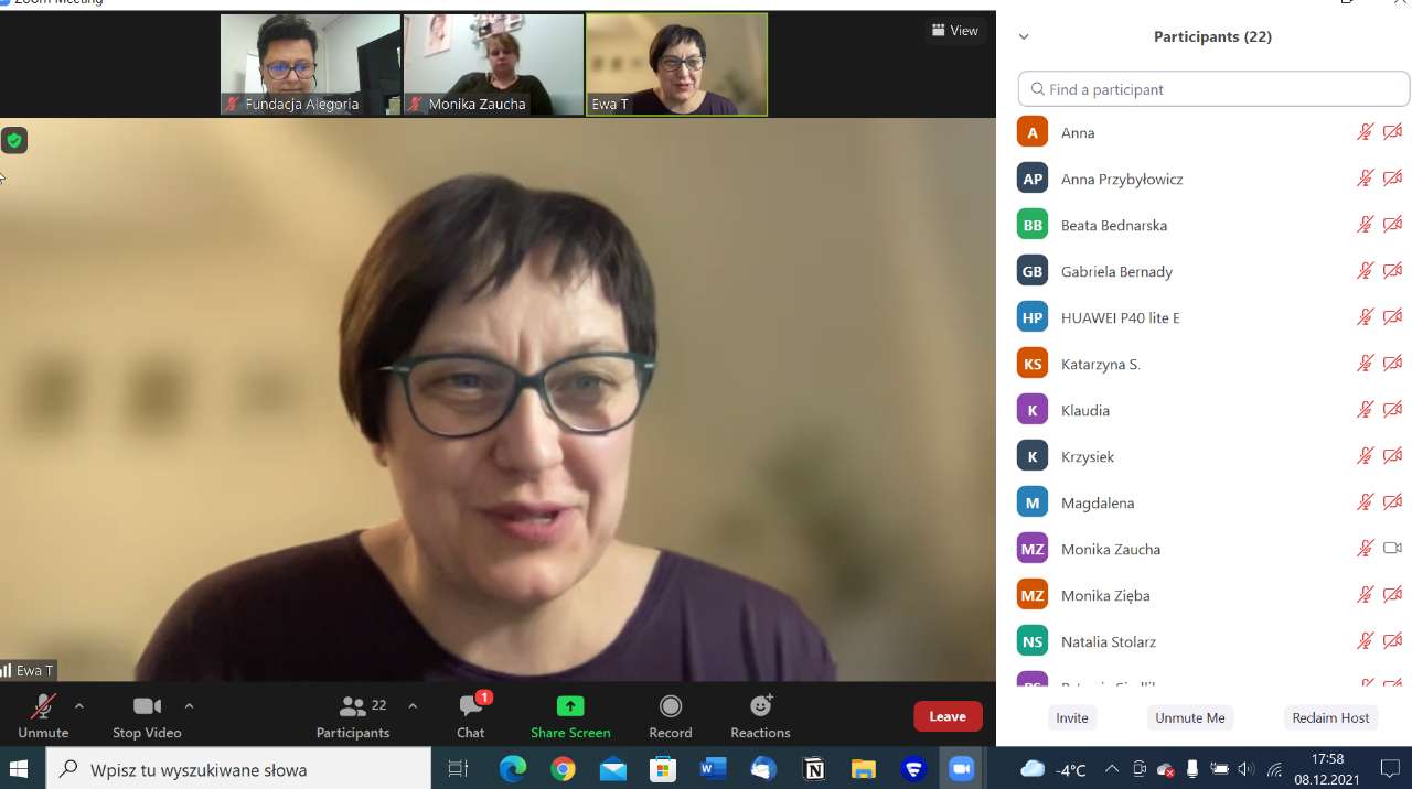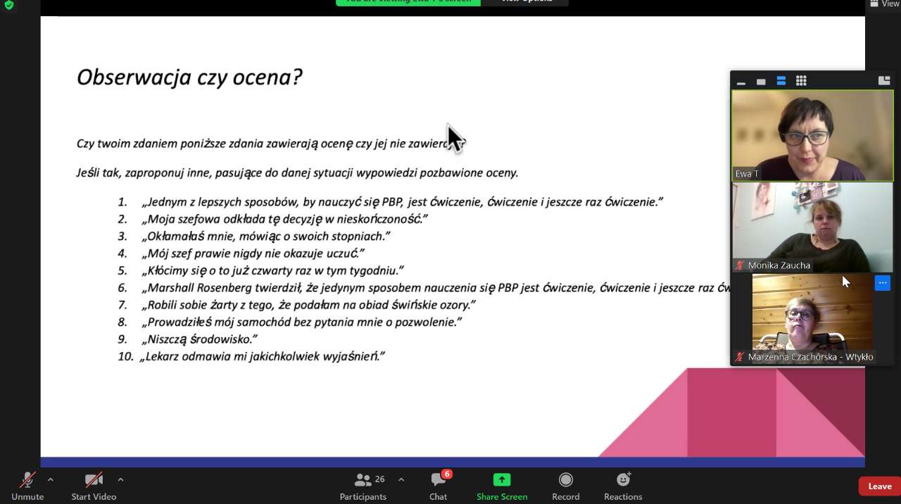 Warsztaty online poświęcone były temu, jak radzić sobie z trudnymi, bolesnymi komunikatami, składające się z 2 spotkań w formie praktycznych zajęć. W tym obszarze było to drugie spotkanie. Poprowadziła je Ewa Tyralik - Kulpa. Trenerka z 10-letnim doświadczeniem, przeprowadziła kilka tysięcy godzin szkoleń z obszaru empatii, komunikacji i rozwoju osobistego; rekomendowana przez Polskie Towarzystwo Psychologiczne; psychoterapeutka Gestalt (w trakcie szkolenia). Na stałe związana ze Szkołą Trenerów Komunikacji opartej na Empatii.
