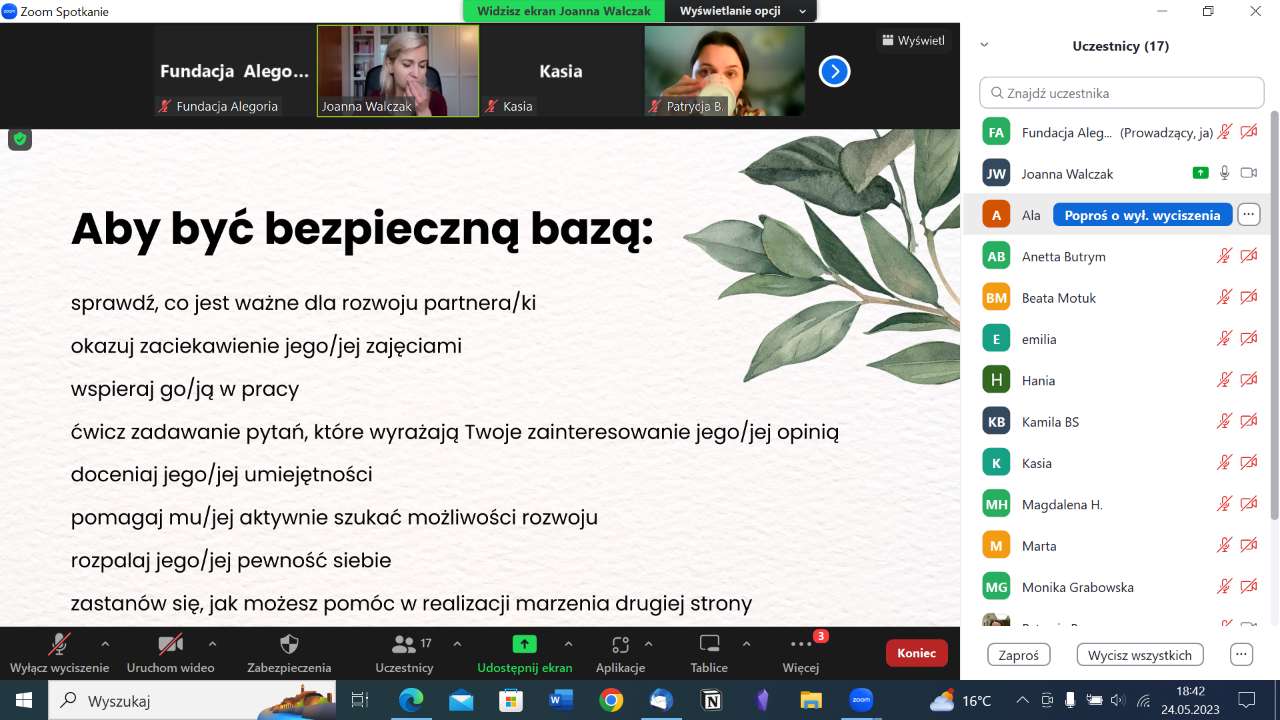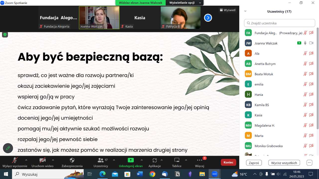 Warsztaty poprowadziła Joanna Walczak, psycholożka oraz certyfikowana psychoterapeutka Polskiego Towarzystwa Terapii Poznawczej i Behawioralnej. Zakres tematyczny warsztatów obejmował: zidentyfikowanie przeszkód w budowaniu bliskości oraz opracowywanie strategii ich przezwyciężenia. Praktykowanie i wzmacnianie więzi poprzez dotyk, eksplorując nowe formy intymności. Ponadto stwarzanie indywidualnych planów aktywności, które będą sprzyjać zacieśnianiu partnerskiej relacji. Uczestnicy poznali także techniki redukcji stresu, które można praktykować wspólnie z partnerem, aby zwiększyć poczucie bliskości,