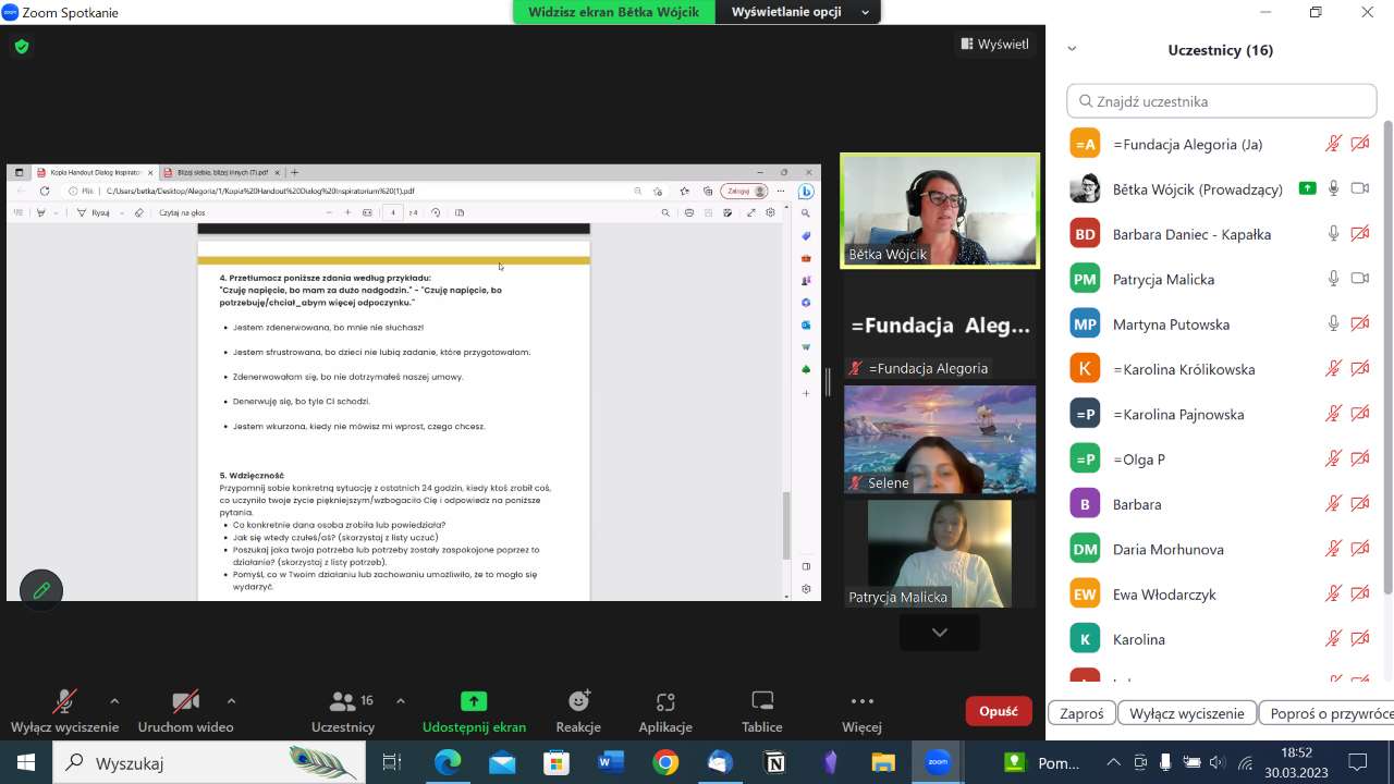 To kolejny warsztat, który dla naszych uczestników przygotowała Bietka Wójcik. Ja i Ty - w drodze do dialogu to cykl bezpłatnych warsztatów online, podczas których uczestnicy poznali narzędzia przydatne na co dzień w komunikacji i budowaniu dialogu. Zostały one przećwiczone w praktyce na przykładach z codziennego życia, tak aby mogły wesprzeć uczestników w słuchaniu i wyrażaniu siebie.