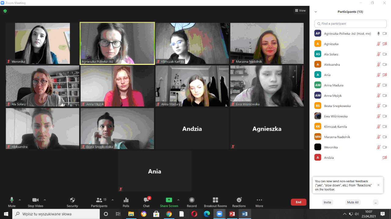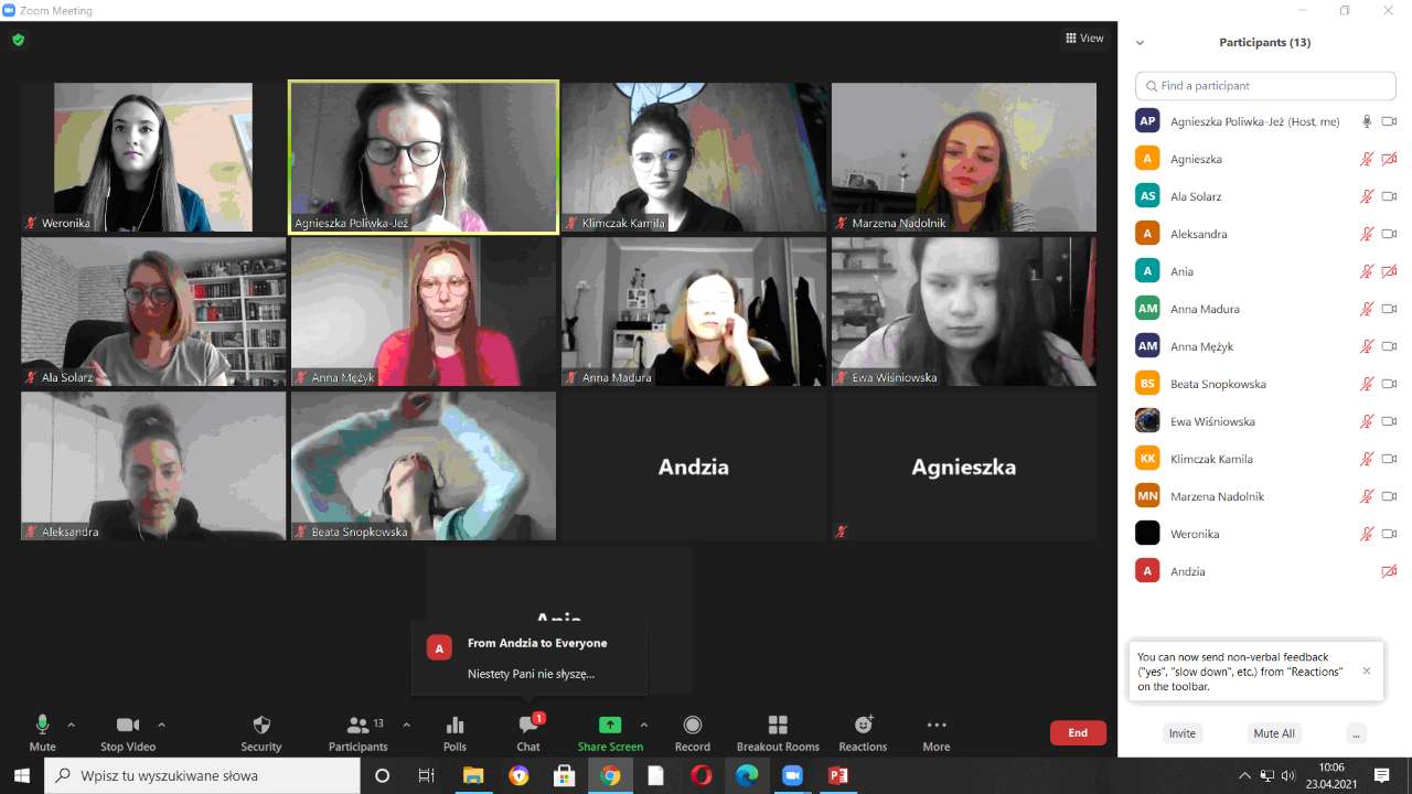 Informacja zwrotna stała się tematem warsztatu, który przygotowała Agnieszka Poliwka - Jeż. Zwróciła ona uwagę, że taka ifnormacja może bardzo pomóc w pracy nauczyciela, jest sygnałem od ucznia na ile opanował okreśłony materiał. Uczestnicy warsztu mogli przekonać się o roli takiej informacji, jaką może ona pełnić.